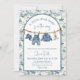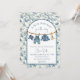 A charming watercolor illustration featuring adorable baby clothes — denim overalls, a jacket, and tiny boots — gently hanging on a clothesline beside a soft stuffed giraffe. The scene is set against a classic blue-and-white toile background decorated with cowboy motifs, creating a nostalgic and refined look. All elements are beautifully arranged within an elegant arch-shaped frame with a delicate scalloped edge, adding a sophisticated and timeless touch.