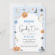 Invitación del primer cumpleaños del chico 'Spooky One' - temática espumosa de halloween azul en la primera invitación de boo-day con un diseño de arco. Azul claro, naranja, negro y blanco con adorables jack-o-langoles, fantasmas felices con gorras fiestas, gorra brujo, gato negro, calabazas, murciélagos, arañas y maíz dulce. Personaliza con tu nombre de hijo y detalles del fiesta.
