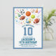 Featuring colorful sports balls, party hats, confetti, and a bold customizable age, this design is perfect for a 10th birthday sports party or any energetic kids celebration.