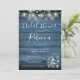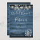 Una rústica invitación a la ducha de novias con luces de cuerdas de bonito y jarras de albañil con una elegante tipografía de escritura, sobre un fondo azul rústico de madera. Diseñado por Thisisnotme©