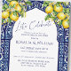 This lemon-themed engagement shower invitation features fresh watercolor illustrations of lemons and delicate lemon blossoms, paired with a Mediterranean tile pattern arranged in a soft arched shape for an elegant, sun-soaked look. The headline “Let’s Celebrate” adds a joyful and inviting touch.