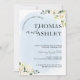 Anuncie su día especial con elegancia atemporal usando esta Invitación a la Boda de Rosa Blanca y de la Color Azul. Con un suave lavado de acuarela en tonos azules tranquilizantes y detallados flores blancas de rosa, esta invitación marca un tono romántico y refinado para su celebración. Perfecto para bodas clásicos, de jardín o modernos. Personalizable total con tu redacción y detalles del boda para que se adapten a tu historia de amor única.