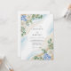 This ethereal design evokes a serene, artistic mood with its flowing watercolor washes in tranquil blues and creamy whites. Delicate white roses, soft blue hydrangeas, and verdant eucalyptus leaves intertwine, creating a harmonious blend of nature and abstract artistry. The overall palette is soft and airy, perfect for a romantic, nature-inspired event.
