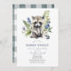 This cute "berry sweet" boy's baby shower invitation features a baby raccoon, greenery, blueberries, and a purple flower in watercolor. The reverse side features a white background with dusty blue gingham/buffalo plaid/check. Personalize it for your needs. You can find more bunny products at my store.