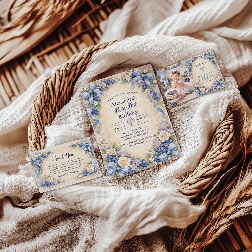 This soft blueberry garden collection features delicate florals and mixed berry details arranged in a romantic storybook frame. The airy ivory background and muted blue tones create a timeless, elegant look perfect for a Berry First celebration. Designed to feel refined yet playful, this collection works beautifully for garden parties, spring celebrations, and sweet first birthdays with a classic botanical aesthetic.