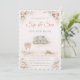 Blush floral home gathering design featuring soft rose borders, champagne glasses, and key detail with a centered home illustration. Clean serif and script typography in warm neutral tones, suited for hosting a new home sip and see with drinks and guided home tour.