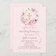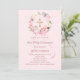 Blush pink background, decorated with watercolored pink and white flowers in a wreath and a golden cross. A pink bow. Personalize and add a name and details.