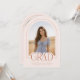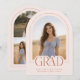 Introducing our blush pink arch photo graduation announcement—a sleek, modern keepsake designed with minimalist elegance. The front features an arch-shaped photo with a thin border and the word "grad" partially overlaying the photo. Text is in terracotta / burnt orange. Personalize the template by adding your graduation year, name, and school to create your announcement with ease. On the back, upload an additional 4 photos to the collage. © Kimbellished, LLC