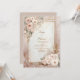 Immerse your guests in a world of soft luxury with this breathtaking invitation design. The background features a sophisticated blush marble texture, swirled with veins of cream and scattered with faux gold glitter dust for a magical, shimmering effect. A refined, geometric double-line frame in an antique gilded finish overlays the stone texture, creating a structured center for your text. Adorning the top left and bottom right corners are lush bouquets of soft pink and ivory roses, accented with sage green leaves and striking metallic bronze foliage. This romantic and feminine design is a flawless choice for a spring garden wedding, a luxurious bridal shower brunch, or a sweet sixteen birthday party. You might also select this polished aesthetic for a quinceañera, a milestone anniversary dinner, or an elegant engagement announcement for a couple who loves modern glamour.