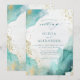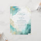 Esta invitación de boda abstracta moderna de playa presenta fuentes modernas de moda con caligrafía de guión elegante, enmarcada por salpicaduras de tinta de alcohol azul turquesa y dorado.