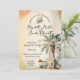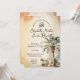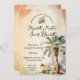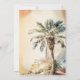Elegantes invitaciones a bodas acuarelas en tonos vintage con una gran palmera, letreros y gafas de sol.