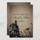 Este diseño hermoso y elegante, llamado Boda Aniversario Casa Gótica Vintage, tiene un fondo color taupe o casi sepia. En la esquina inferior izquierda hay una ilustración de una antigua casa gótica. En el lado derecho hay flores y enredaderas y una ilustración de un cuervo. Esto sería perfecto para su fiesta o evento de aniversario de bodas.