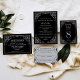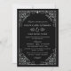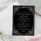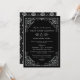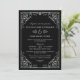 Elegantes y glamorosas invitaciones de bodas artísticas deco inspiradas en el estilo Gatsby vintage y los años 20. El diseño de la tarjeta presenta un esquema de color gris negro y plateado, un marco y un patrón decorativos ornamentales y una tipografía elegante que puede ser completamente personalizada.