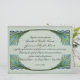 Este diseño presenta un fondo de aspecto envejecido en un color pergamino con tonos verdes y algunas plumas de pavo real de estilo Art Nouveau como borde decorativo. Esto funciona durante casi cualquier temporada, formal o informal.