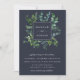 Marco rústico de follaje, invitación a la boda. Elegante vegetación acuática en tonos modas de verde y azul. La tarjeta presenta un color de fondo azul marino sólido.