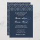 Este damasco azul de medianoche hace una invitación elegante del boda. Usted puede experimentar con diversos tipos de papel para conseguir apenas la mirada que usted quiere. Recomiendo el papel de lino, o el papel metálico hued del hielo que da a su invitación un reflejo y un brillo especiales. Esta invitación viene con un sobre clasificado A7.