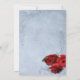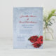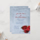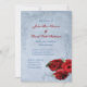 Elegante diseño de invitación a bodas en cascada de color azul con rollos decorativos en la esquina superior e inferior con una foto de tres rosas rojas en la esquina inferior. El fondo recibe una aplicación de grunge texturado para una apariencia de papel antiguo. Este diseño tiene varios antecedentes ya hechos. Este diseño también viene en muchos otros productos de papelería para satisfacer todas las necesidades de su boda.