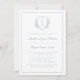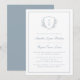 Invitación de Boda Azul Monogramada. Esta elegante y distinguida invitación de boda presenta una cresta de hojas azul polvorienta con el monograma de la novia y el novio y un borde doble clásico. El texto es azul polvoriento, y la parte posterior de la invitación es azul polvorienta.