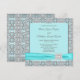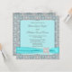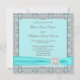 Elegante invitación de boda azul turquesa con encaje plateado. Agregue sus datos en la parte delantera y trasera añadiendo los detalles del evento, estilo de fuente, tamaño y color de la fuente, y redacción.