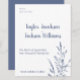 Diseño moderno y sencillo en pizarra azul y blanco. Este diseño limpio es elegante y atemporal. Tipografía de script para nombres. Acentuado con hierbas.