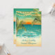 Palmeras y lámparas de cuerda rodean la puesta de sol del océano y la orilla de arena en esta encantadora boda de playa Invitation. Personalizar el texto moderno y elegante en la parte delantera y trasera con la información de su boda.