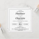Elegante boda de guiones invitación cuadrada física o digital imprimible en blanco con letras negras y un marco delicado. Personalízalo con los nombres de Mr. y Mrs., apellidos, fecha, ubicación, registro e información de RSVP. La parte posterior se puede personalizar con las iniciales de la pareja.