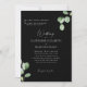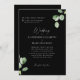 Invitación a la boda de eucalipto en blanco y negro. Fondo negro. Se enumeran los dos conjuntos de padres.
