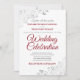 Invite a sus invitados a compartir en su celebración boda con estas elegantes invitaciones de moda. Presenta un texto de guión rojo y gris elegante sobre un fondo blanco con un Relieve metalizado floral plateado en las esquinas. Diseño sencillo con una redacción formal para que su boda sea realmente especial.