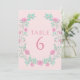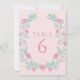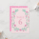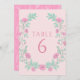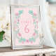 Las mesas, de boda bohemia, están inmersas en una elegancia intemporal y cuentan con una delicada corona floral adornada con flores rosadas y verdes verde azuladas. El diseño se complementa con un texto rosa simple y minimalista que aporta un toque de sofisticación a la decoración boda. Explore nuestra colección para ver más números de mesa inspirados en bohemias que mezclen estilo y gracia a la perfección en su celebración boda.
