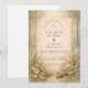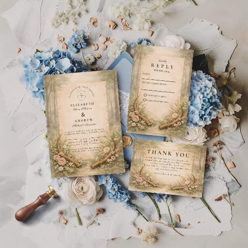 Un diseño romántico inspirado en el bosque que presenta flores neutras suaves, cuernos elegantes y un fondo cálido de pergamino vintage. La composición combina vegetación orgánica con detalles refinados para una estética boho atemporal que se siente íntima y elevada. Perfecto para parejas que se sienten atraídas por la naturaleza, el lujo discreto y el romance clásico con un toque rústico.