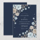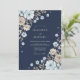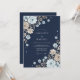 Delicadas flores y acentos frondosos en azules suaves, cremas y taupe se desvanecen sobre un fondo marino profundo. Este diseño evoca un ambiente romántico y caprichoso, perfecto para una celebración sofisticada. El arreglo floral sugiere una mezcla de anémonas y flores de relleno sutiles.