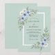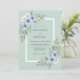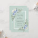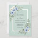 Este diseño presenta un suave fondo verde espuma de mar decorado con delicadas flores de acuarela en tonos de azul cielo y marfil. Elegantes hojas de eucalipto y ramitas de follaje acentúan la composición, creando una estética botánica serena. Perfecto para un evento romántico de primavera o verano, esta obra de arte evoca una sensación de belleza natural y tranquilidad.