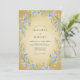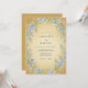 Una delicada corona de suaves flores azules celestes y exuberante follaje verde crea un borde etéreo y romántico. El fondo cálido y dorado realza la belleza natural del arreglo botánico, evocando una sensación de elegante delicadeza y encanto atemporal. Este diseño ofrece una estética soñadora y bucólica perfecta para una ocasión serena.