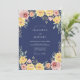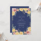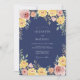 Un fondo profundo de color azul marino establece un escenario sofisticado para vibrantes flores de acuarela en tonos de amarillo soleado, melocotón y rosa pálido. Rosas pintadas, ranunculus y delicado follaje verde crean una atmósfera romántica. Este diseño botánico destaca la elegante artesanía a través de suaves pinceladas y rico contraste de color.