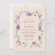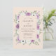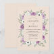 Este diseño presenta un suave fondo de melocotón adornado con un exuberante borde de rosas de lavanda y anémonas blancas. Delicadas hojas de eucalipto verdes y ramitas púrpuras añaden un sentido de movimiento y gracia natural. La paleta de colores románticos de lila y verde salvia crea una estética etérea perfecta para un evento primaveral al aire libre.