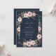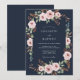 Este diseño muestra un fondo profundo de azul medianoche complementado con suaves rosas rosadas y hojas intrincadas de eucalipto. La paleta de colores sombríos evoca un sentido de elegancia sofisticada, lo que la hace ideal para una noche formal o un evento de otoño. Las flores y el follaje ricamente detallados en acuarela crean una estética lujuriosa y atmosférica.