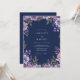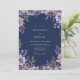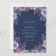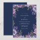 Delicadas flores de lavanda y lila caen en cascada sobre un fondo azul marino profundo. Los acentos de hojas doradas añaden un toque de sofisticación a esta disposición floral etérea. El diseño evoca una atmósfera romántica y refinada para su día especial.