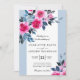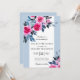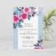 Elegante diseño de invitación a la boda con rosas de acuarela rosa brillante, follaje azul y gris sobre un fondo blanco y azul. El lado inverso de la invitación está en un color azul polvoriento.