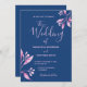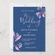 Una simple invitación a la boda de moda en azul y rosa. Un fondo azul decorado con ramas y follaje de color rosa botánico. Guión moderno de gran tamaño con letra, tipografía con el texto: El boda de. Plantillas para nombres y detalles del boda. texto de color rosa Subió. Fondo azul.