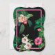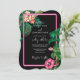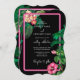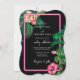 Una moderna pero retro temática neón rosado botánico sobre fondo negro. Un bonito diseño boda ideal para el verano. Diseño perfecto de plantas tropicales de neón rosa con palmeras, flores rosadas de Hibiscus y flores Plumerias Frangipanis. Los colores negro, rosa y verde dominan este diseño de neón rosa tropical. La moderna tipografía caligráfica contrasta perfectamente con el diseño de temática boda negro y rosa. Diseño elegante y elegante de la invitación a la boda con elementos modernos y sencillos. También están disponibles artículos de papelería para bodas y otros formatos de invitación para bodas.