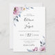 Elegantes arreglos florales de color azul, malva y agua blanca con suaves ramas botánicas, invitación a la boda. Plantilla de diseño de tipografía romántica. La parte posterior de la tarjeta presenta un color azul polvoriento y de coordinación sólido.