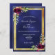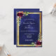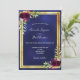 Una invitación de boda moderna y de moda. Un fondo azul oscuro, azul marino. El color azul es desigual. Con un marco de oro falso y flores de color burdeos, flores de vegetación. Plantillas para sus nombres e información de la ceremonia. Los nombres se escriben con una escritura de estilo con letras a mano moderna. Fondo azul.