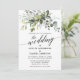 Escritura moderna de caligrafía, tarjeta de invitación a la boda de la Boda de color de agua elegante con vegetación botánica incluye hojas de eucalipto, follaje botánico verde, hojas azul polvorientas y otros hermosos paisajes botánicos. Atrás verde.