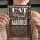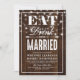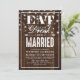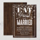 Con un fondo de madera rústica, luces de hadas románticas, las palabras "COME, BEBE Y CÁSATE" y los detalles de su boda.