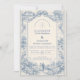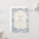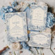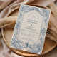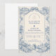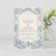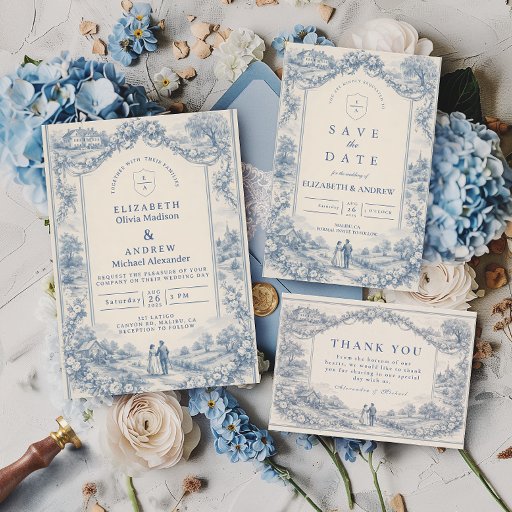 Un refinado diseño de boda de toile azul inspirado en clásicos grabados del campo francés. Un delicado paisaje pastoral, jardines cuidados, caminos de piedra y flores floreciendo enmarcan la parte inferior en intrincado trabajo de línea azul monocromática. El lavado suave del cielo de marfil mantiene la zona superior luminosa y equilibrada, creando una composición atemporal y sofisticada. Perfecto para una celebración de boda romántica en una finca, jardín o con inspiración europea.