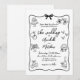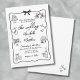Invitación de boda caprichosa dibujada a mano. Este diseño artístico y juguetón es perfecto para parejas que buscan infundir su gran día con un ambiente creativo y ligero. Estilizado en una paleta atemporal en blanco y negro, se siente como una obra maestra personal y dibujada a mano que es encantadora y única. Un marco ondulado y giratorio adornado con un lazo delicado llama la atención sobre los detalles de su boda, presentados en una mezcla de fuentes de escritura y estilo manuscrito para un toque relajado y elegante.