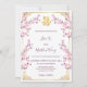 Esta invitación contemporánea a la boda china incluye un marco asiático dorado, flores de cerezo rosadas y un símbolo de doble felicidad artístico dorado sobre un fondo blanco. Con una foto de un personalizado y un escaneado código qr en la parte trasera.