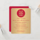 Un diseño contemporáneo con el personaje chino "Doble felicidad" como sello circular. La "doble felicidad" escrita xi o "hsi" en mandarín y pronunciada "shuang-xi" es un conocido personaje chino usado tradicionalmente en boda chino como símbolo de amor, felicidad y suerte para la recién casada pareja. El color rojo es un color auspicioso y popular en la cultura china. Simboliza suerte, felicidad y alegría. El uso del oro como color de fondo trae prosperidad y éxito a la unión. Un diseño verdaderamente apropiado para cualquier celebración de bodas chinos.