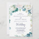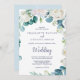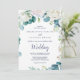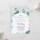 Esta clásica tarjeta de invitación a la boda de flores blancas es perfecta para una boda de primavera. El elegante diseño floral presenta rosales blandas de marfil y blanco, peonías y crisantemo con toques de flores de acuarela azul perwinkle y follaje verde.