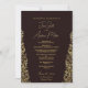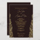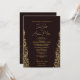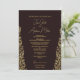 Esta carta de invitación a la boda tiene un diseño elegante y lujoso con un fondo de marrón profundo y adornados patrones de estilo Damasco dorado a lo largo de los lados. El oro intrincado florece enmarca el texto maravillosamente, dándole una apariencia real y clásica. El texto del centro, escrito en una mezcla de caligrafía moderna y fuentes serif, es completamente personalizable: todos los nombres, fechas, ubicaciones y mensajes se pueden editar para adaptarse a la pareja y a la ocasión. Las letras doradas complementan el borde ornamental, creando un aspecto cohesivo y regal. En general, la carta destaca la sofisticación con su rico contraste de color de marrón oscuro y oro brillante, mientras que los elementos de diseño inspirados en Damasco le dan un toque de tradición y belleza intemporal.